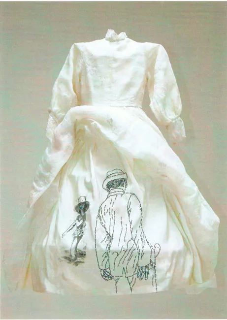 Instalación de un vestido de primera comunión bordado que alude sutilmente a las prácticas de acoso sufridas por muchas menores.
